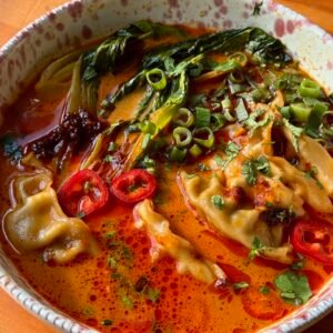 This Thai red curry dumpling soup is pure comfort in a bowl, rich with coconut milk and a gentle kick of spice. The dumplings soak up the fragrant broth while the pak choi brings a burst of freshness. It’s quick to make, deeply satisfying, and ideal for evenings when you want something nourishing without much fuss.